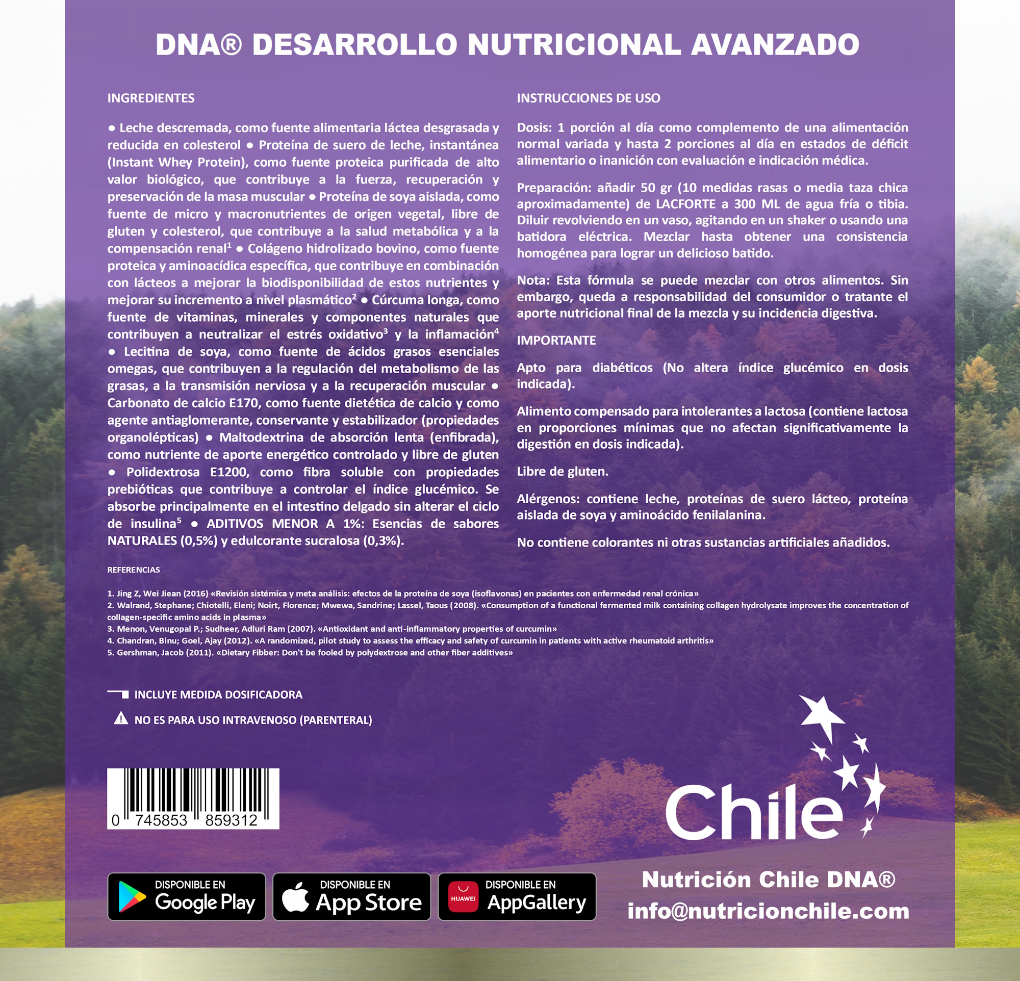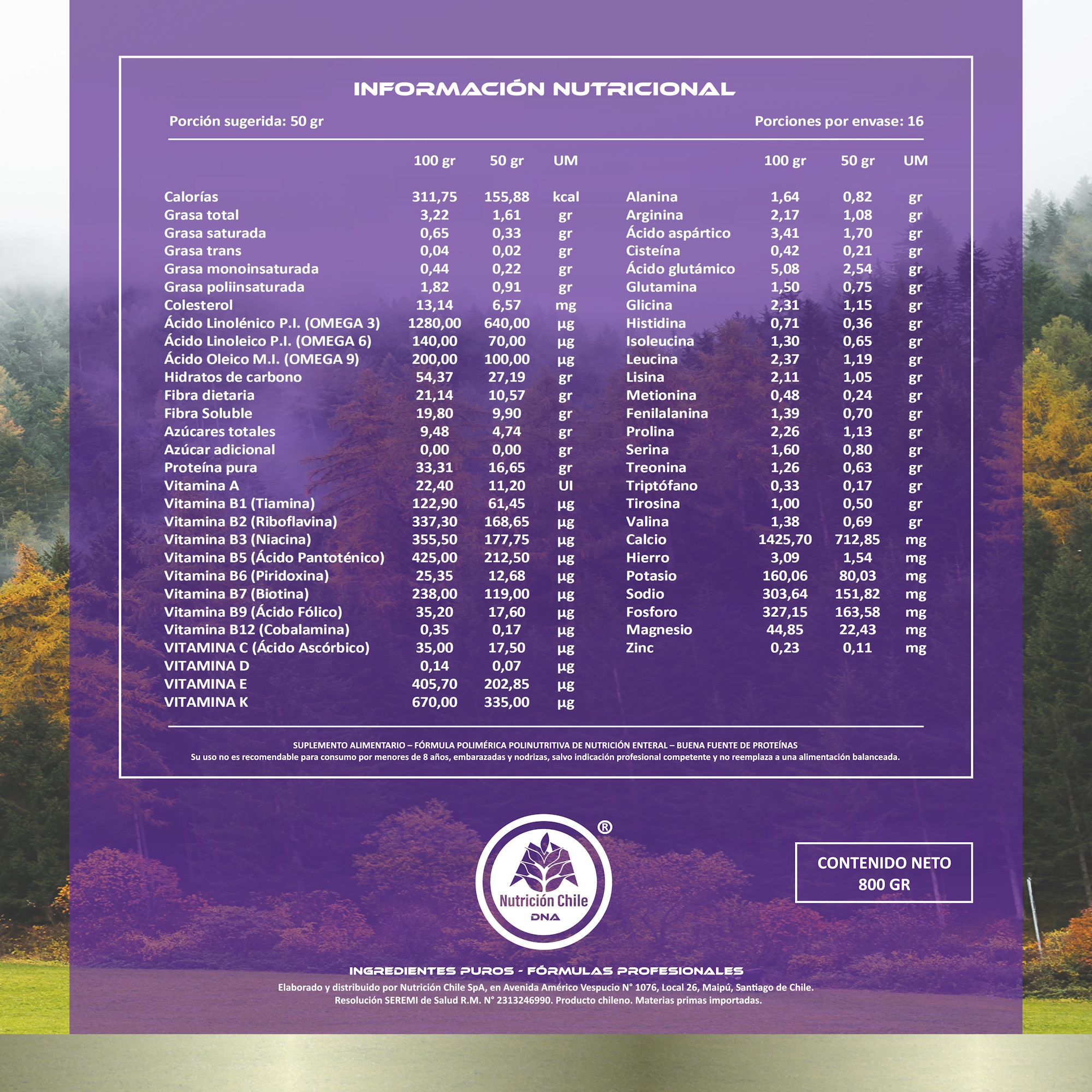 – Leche descremada, como fuente alimentaria láctea desgrasada y reducida en colesterol – Proteína de suero de leche, instantánea (Instant Whey Protein), como fuente proteica purificada de alto valor biológico, que contribuye a la fuerza, recuperación y preservación de la masa muscular – Proteína de soya aislada, como fuente de micro y macronutrientes de origen vegetal, libre de gluten y colesterol, que contribuye a la salud metabólica y a la compensación renal – Colágeno hidrolizado bovino, como fuente proteica y aminoacídica específica, que contribuye en combinación con lácteos a mejorar la biodisponibilidad de estos nutrientes y mejorar su incremento a nivel plasmático – Cúrcuma longa, como fuente de vitaminas, minerales y componentes naturales que contribuyen a neutralizar el estrés oxidativo y la inflamación – Lecitina de soya, como fuente de ácidos grasos esenciales omegas, que contribuyen a la regulación del metabolismo de las grasas, a la transmisión nerviosa y a la recuperación muscular – Carbonato de calcio E170, como fuente dietética de calcio y como agente antiaglomerante, conservante y estabilizador (propiedades organolépticas) – Maltodextrina de absorción lenta (enfibrada), como nutriente de aporte energético controlado y libre de gluten – Polidextrosa E1200, como fibra soluble con propiedades prebióticas que contribuye a controlar el índice glucémico. Se absorbe principalmente en el intestino delgado sin alterar el ciclo de insulina – ADITIVOS MENOR A 1%: Esencias de sabores NATURALES (0,5%) y edulcorante sucralosa (0,3%).